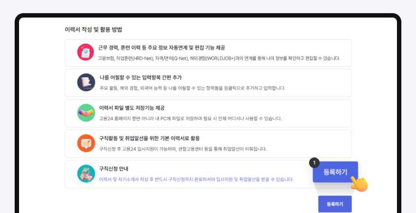 ▶ 이력서 작성방법 맨 아래 등록하기 메뉴를 이용해 등록합니다.