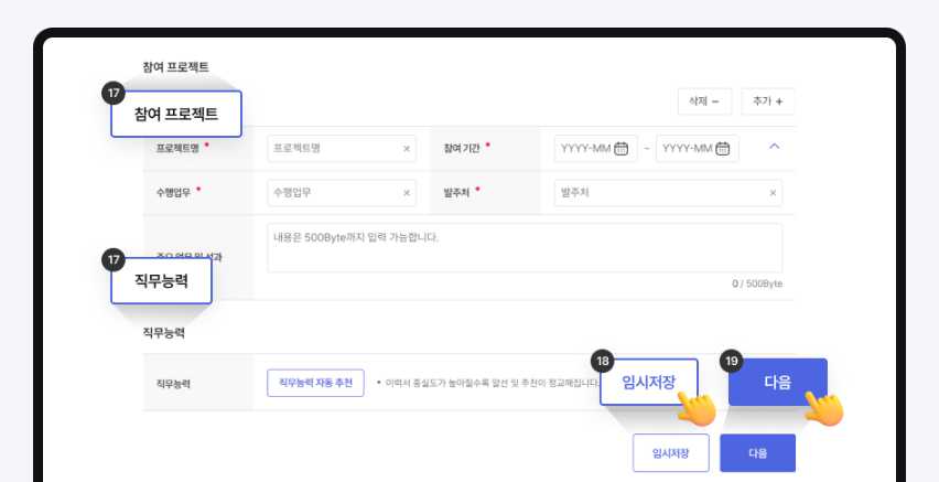 ▶ 이전 근무지에서 참여한 프로젝트나 직무능력 등을 체크하고 기재한 뒤 임시저장을 해둡니다.