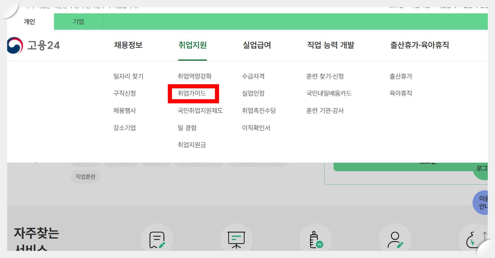 ▶ 고용24 재취업활동으로 직업심리검사를 실업인정일에 고용센터에 업로드 하려면 꼭 로그인 한 후에 진행하셔야 합니다. 메인페이지에서 취업지원 > 취업가이드 카테고리로 이동합니다.