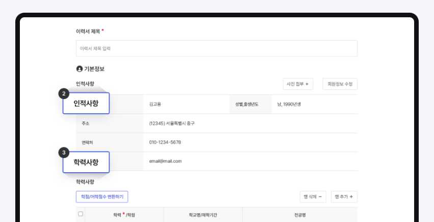 ▶ 기본 인적사항과 보유역량은 학력사항으로 학력, 학점, 학교명, 재학기간, 전공명 등을 입력합니다.