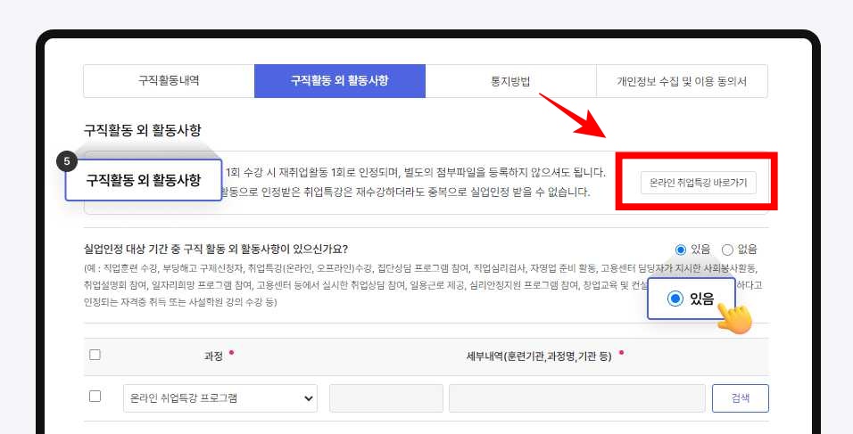 ▶ 제출할 때 구직외활동에 있음을 체크하고 아래 과정에서 수료한 강의를 선택해 제출하면됩니다.