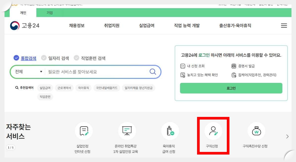 ▶ 고용24 메인페이지의 '구직신청' 메뉴나 채용정보의 '구직신청'메뉴를 통해 이동합니다.