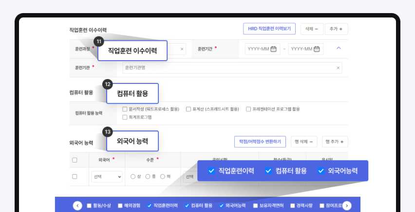 ▶ 직업훈련을 했는지 여부와 컴퓨터 활용능력, 외국어 공인시험점수, 수준 등 이력서에 자신의 능력치를 입력하는 영역입니다.