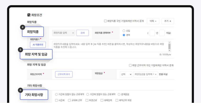 ▶ 취업을 원하는 직종과 지역 그리고 원하는 임금 범위를 기재합니다.