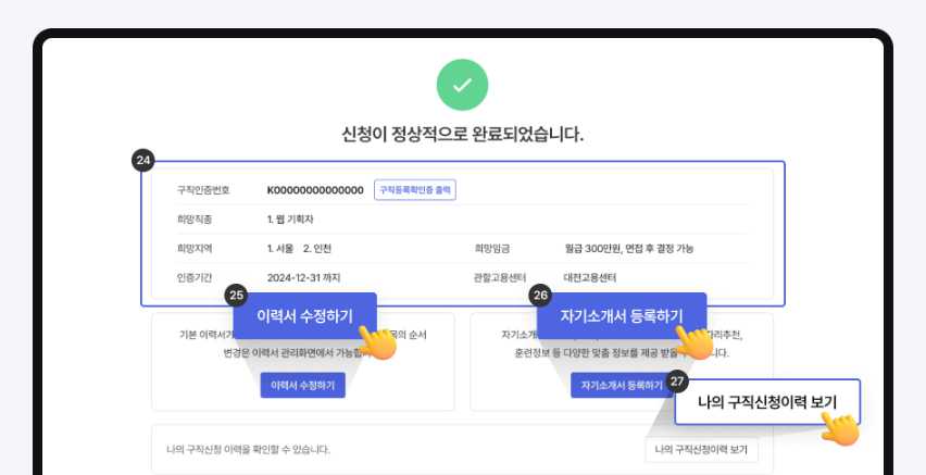 ▶ 모든 양식을 채우고 제출하면 신청 완료와 함께 이력서를 수정할 수 있는 메뉴와 자기소개서를 등록하는 메뉴가 나옵니다. 이력서에 잘못기재하거나 더 기재해야할 사항이 있을 시에 수정하기 메뉴를 이용하시면 됩니다.