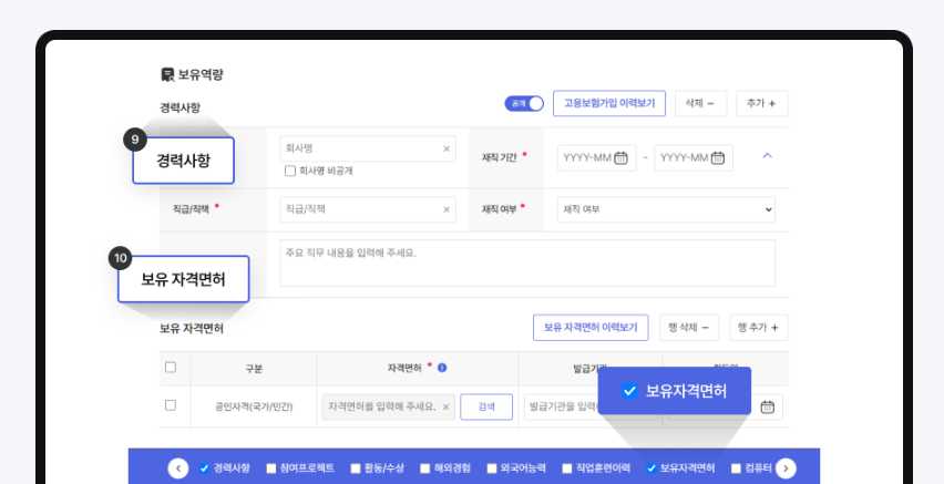 ▶ 보유 자격면허는 소유하고 있는 자격면허에 대해 발급기관, 취득일 등 내용을 입력합니다.