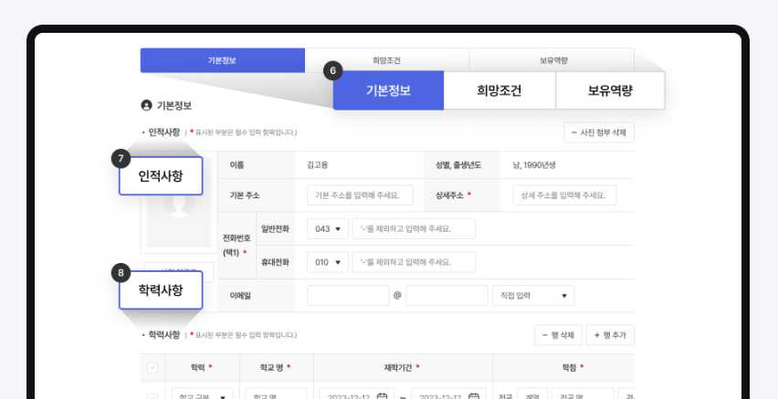 ▶ 기본 인적사항과 보유역량은 학력사항으로 학력, 학점, 학교명, 재학기간, 전공명 등을 입력합니다.