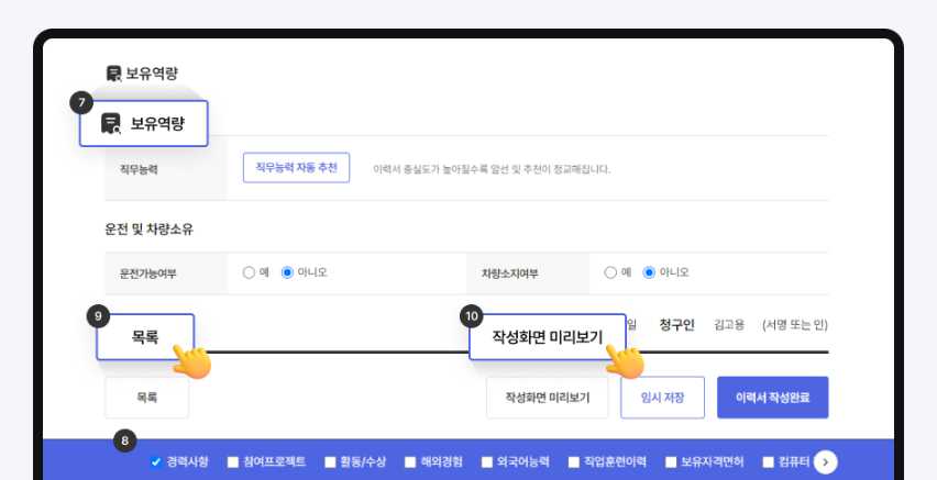 ▶ 이전 근무지에서 참여한 프로젝트나 직무능력 등을 체크하고 기재한 뒤 임시저장을 해둡니다.