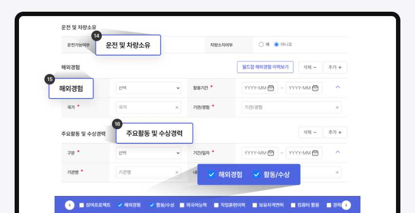 ▶ 운전가능여부와 차량소유, 해외경험이나 수상이력등의 스펙을 기재합니다.