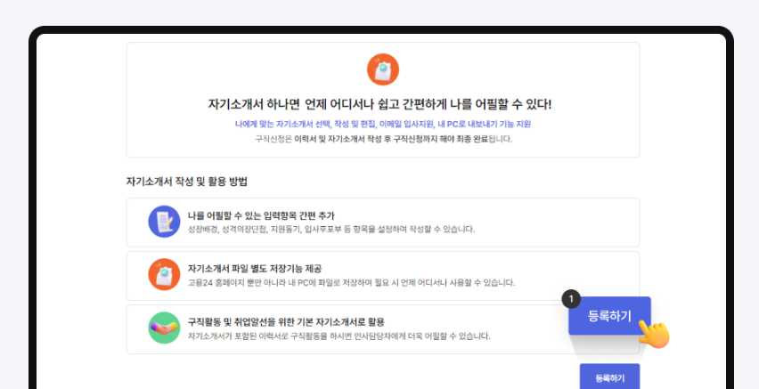▶ 이력서 작성방법 맨 아래 등록하기 메뉴를 이용해 등록합니다.