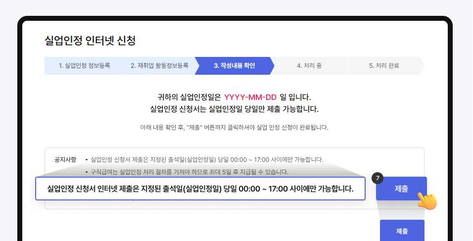 실업인정일 17:00까지 신청서를 전송하지 못했을 경우 PC의 고장이나 공인인증서 문제 등의 사유가 있을 시에는 1회에 한하여 실업인정일부터 14일 이내 관할 고용센터로 출석하여 변경을 신청할 수 있습니다. 특별한 사유 없이 2회 이상은 인정하지 않습니다.