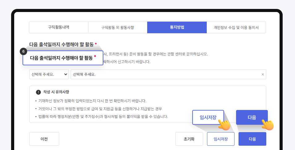 ▶ 재취업활동까지 실업인정 서류 작성이 끝나면 우선 임시 저장을 하고 나서 다음으로 넘어갑니다. 재취업활동은 실업인정일에 지원한 것까지 반영됩니다.